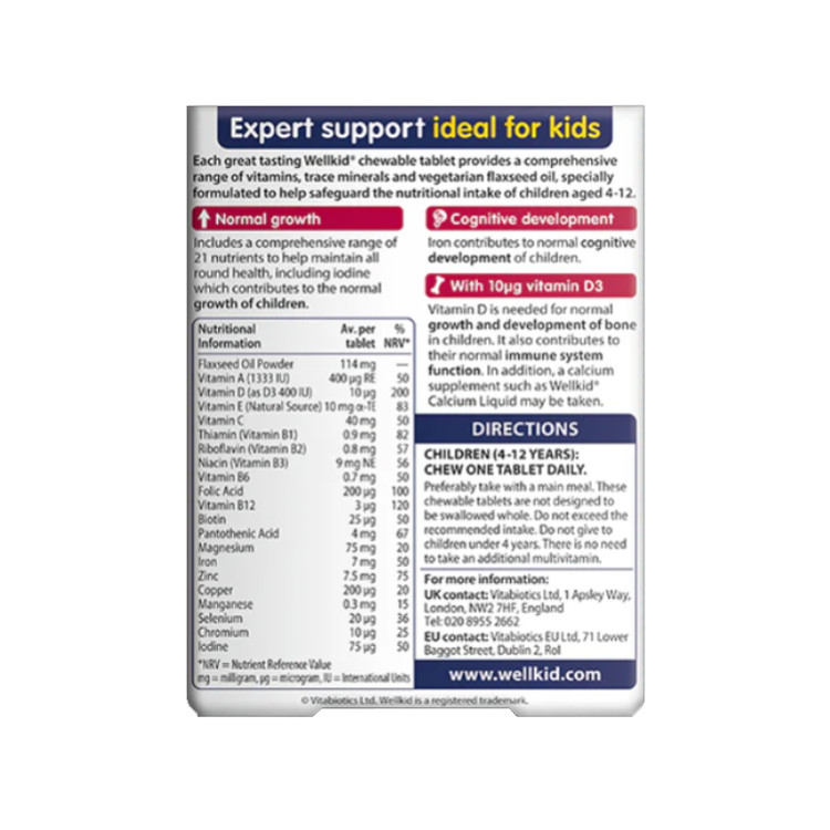 مولتی ویتامین کودکان ول کید ویتابیوتیکس شامل ویتامینهای A، C و D است، همانطور که توسط وزارت بهداشت بریتانیا توصیه شده است، که توصیه میکند به همه کودکان تا ۵ سال هر روز یک مکمل حاوی این ویتامینها داده شود،همچنین توصیه میشود که همه افراد بالای ۴ سال، به خصوص در پاییز و زمستان، مصرف روزانه یک مکمل حاوی ۱۰ میکروگرم ویتامین D را در نظر بگیرند.