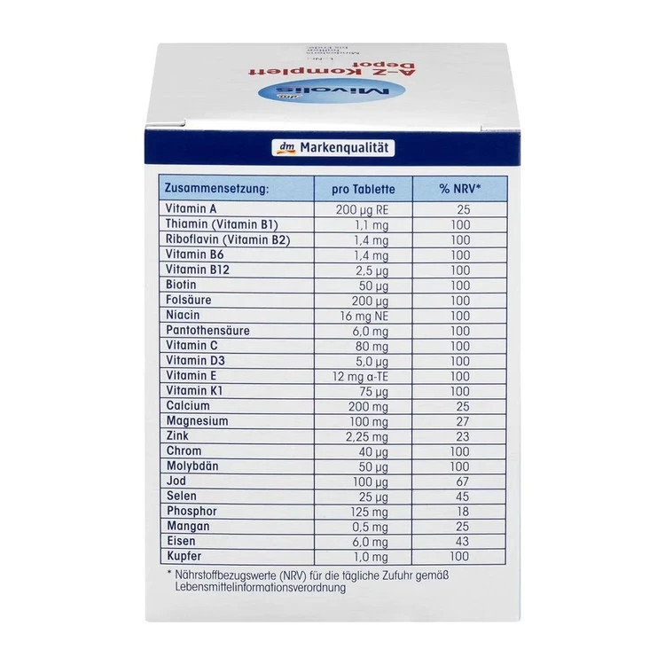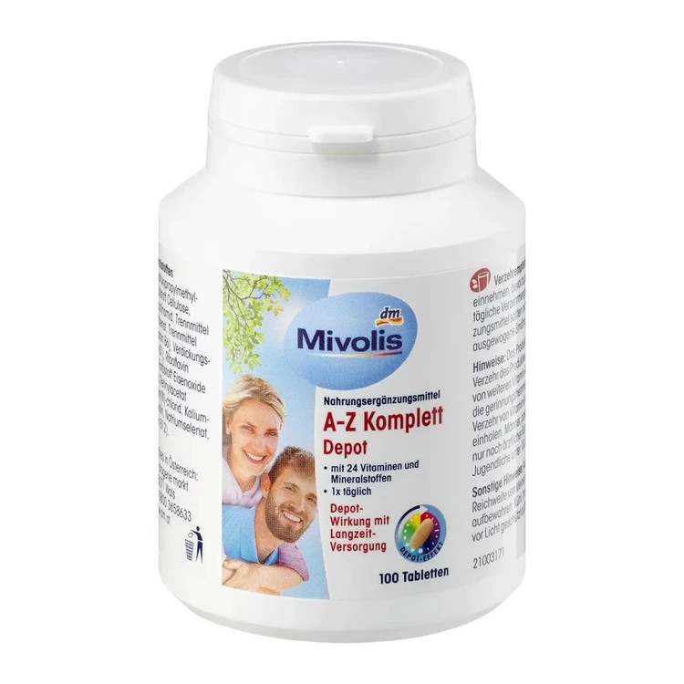 قرص مولتی ویتامین A-Z کامل Mivolis محصولی فوق العاده برای تمامی بزرگسالان و خانم ها و آقایان از برند آلمانی میولیس بوده که یک مولتی ویتامین کامل و شگفت انگیز به شمار می رود. این محصول حاوی تمامی ویتامین ها و مواد موردنیاز بدن در طول روز است و با تامین آن ها به شکل Depot می تواند در طول روز به سلامت عمومی بدن کمک بسزایی کند. قرص مولتی ویتامین میولیس یکی از پرفروش ترین مکمل های مولتی ویتامین در دنیا است و با توجه به اینکه افراد معمولا از رژیم غذایی خود تمامی مواد مغذی را دریافت نمی کنند، بسیار مناسب است. این محصول از تعدادی زیادی ویتامین و مواد معدنی تشکیل شده و هر یک از آن ها می تواند به بهبود عملکر مغز، سیستم عصبی، پوست و مو، کاهش و جلوگیری از بیماری ها و سرطان ها، تقویت سیستم ایمنی و حفظ سلامت افراد کمک شایانی کند. بیوتین موجود در قرص مولتی ویتامین کامل Mivolis از ریزش مو جلوگیری خواهد کرد، آهن و فولیک اسید آن از کم خونی جلوگیری نموده و خاصیت خونسازی دارد، ویتامین های C + E + D به عنوان یک آنتی اکسیدان قوی عمل نموده و از بیماری ها جلوگیری خواهد کرد. همچنین در این مولتی ویتامین کروم، سلنیوم، ید، زینک و منیزیم وجود دارد که هر کدام به نحوی به سلامت عمومی بدن و افزایش کیفیت زندگی کمک می کنند. تعداد 100 عددی این محصول باعث شده تا یک مولتی ویتامین مقرون به صرفه نیز به شمار برود و تا مدت ها شما را از خرید مولتی دیگری بی نیاز کند.