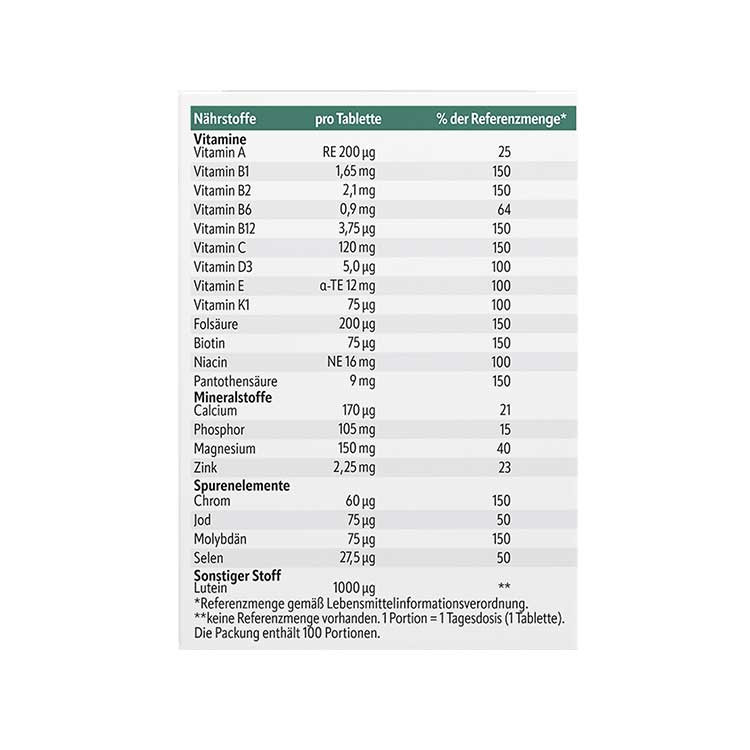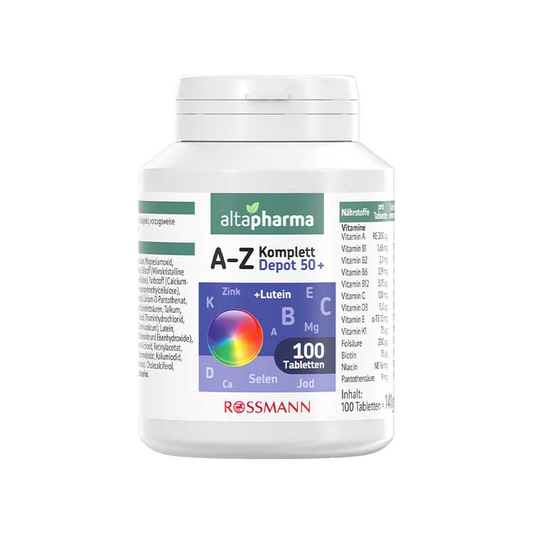 قرص مولتی ویتامین A-Z بالای 50 سال Altapharma ساخت کشور آلمان است و تعداد آن 100 عدد می باشد. در صورتی که به دنبال خرید مولتی ویتامین مخصوص افراد بالای 50 سال با ترکیبات کامل و جامع هستید، این محصول به شما توصیه می شود.