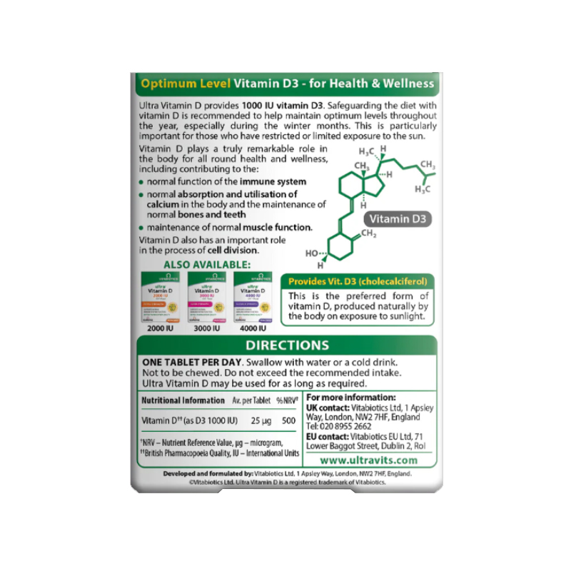 قرص اولترا ویتامین D۳ ویتابیوتیکس محصولی جهت تامین ویتامین D مورد نیاز روزانه بدن و دربردارنده میزان بهینه ویتامین D برای حفظ عملکرد طبیعی سیستم ایمنی و قلبی- عروقی و سلامت استخوان ها است. بر اساس یافتههای اخیر ویتامین D میتواند ۳۶ ارگان در بدن را تحت تاثیر قرار دهد. این ویتامین قادر است با کنترل قند خون از ابتلا به دیابت یا پیشرفت آن جلوگیری کند. همچنین ویتامین D یکی از هورمونهای دخیل در بلوغ گلبولهای سفید خون است، که از این طریق میتواند در بهبود فعالیت سیستم ایمنی موثر باشد. ویتامین D میتواند بر حفظ سلامت عروق و جلوگیری از بروز حوادث قلبی- عروقی نیز تاثیر گذار باشد.